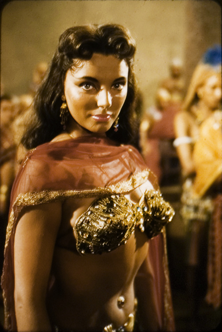 The story concerns the building of the Great Pyramid of Cheops, its Pharaoh Khufu (Hawkins) and his tribulations with his sexpot second wife, Nellifer (hiss!) played with panting pouts by the 21-year-old Collins, upstaged by her own bared midriff (guess I better watch it again to certify my findings).