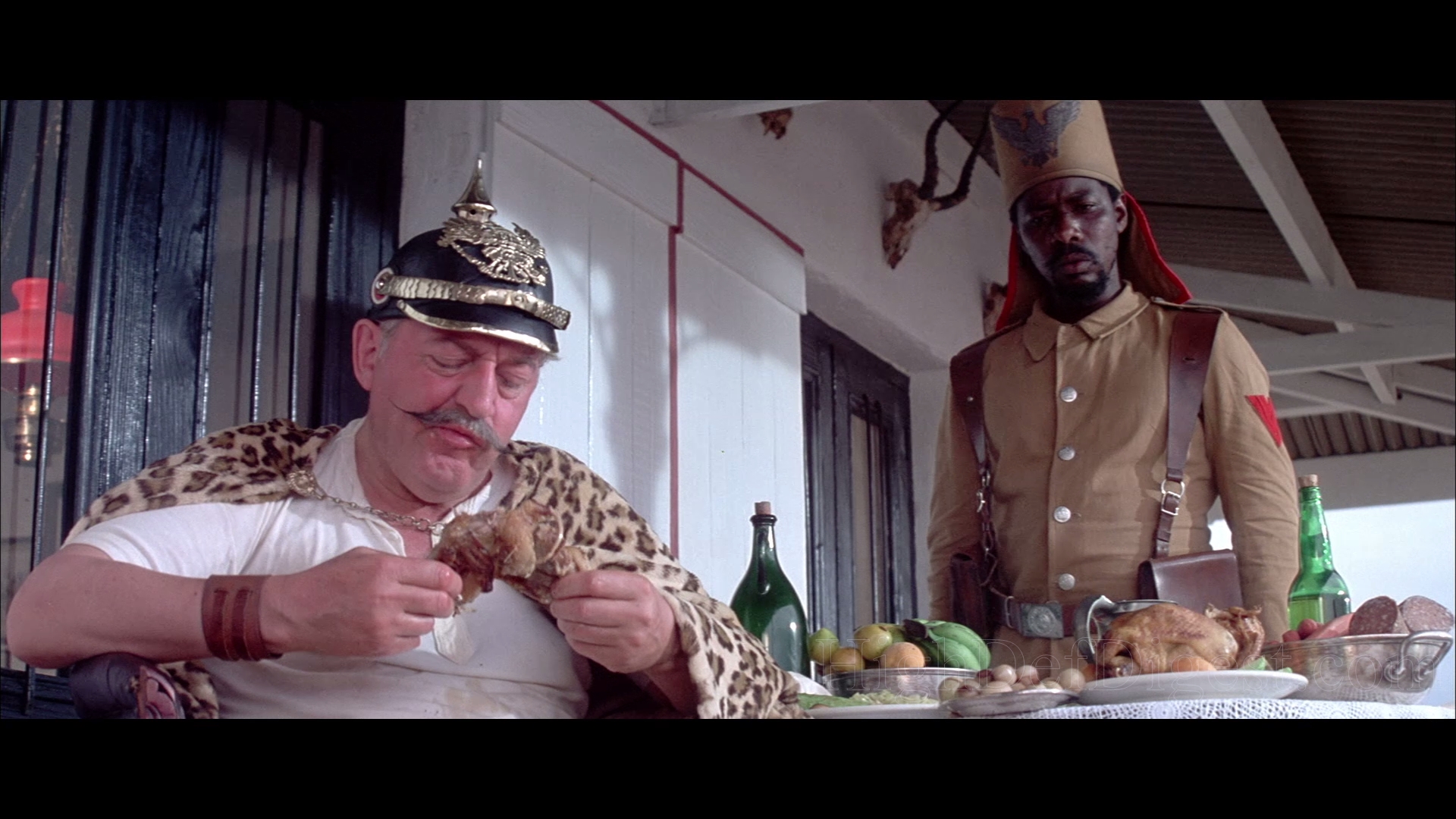 Reinhard Koldehoff plays the gross, brutish baddest bad guy, sporting a spiked helmet, literally spitting chicken: what Transkei scenery left uneaten by Lee is torn to hyena pieces by this fellow. Ian Holm gets thankless comic sidekick duty. Since the Marvin character is so buffoonish, we can’t accept the pretend moments of romance and danger when they shoulder their way in. Simon Sabela, historically notable as the first black South African film director, vivid onscreen as the mighty Cetshwayo in Zulu Dawn, here is demoted to lowly ‘servile village chief’ clowning. He’d previously had a decent role in Gold, another Wilbur Smith story filmed by Hunt in South Africa and also starring Moore. That piece was no gallery-shaker, but it’s better painted than this bigger, more garish canvas.
