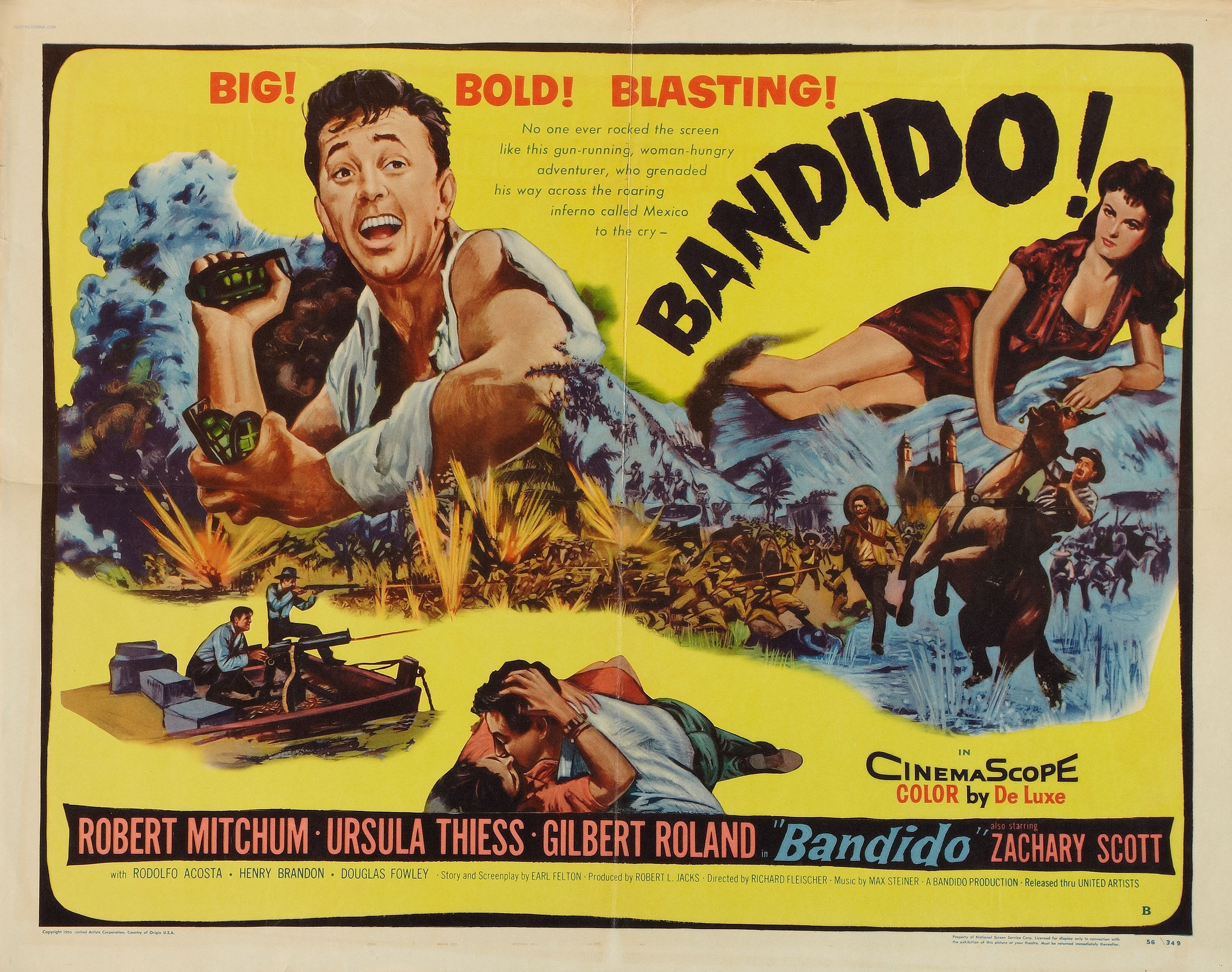 BANDIDO —in 1916 revolutionary Mexico, a mercenary hijacks arms for the rebels, and develops a yen for the arms dealers wife while he’s at it. Enough plot description—now add Robert Mitchum, Gilbert Roland and a slew of real-deal Mexican locations. Direct it with zip, give it CinemaScope, let Max Steiner loose on the score. Have the guns go off in every direction. Arriba!