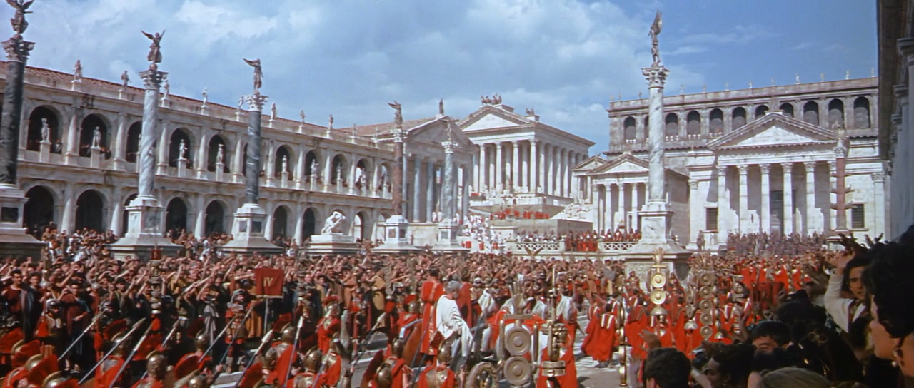The most outstanding element within the stunning overall production design are the fabulous sets, done on as grand a scale as was ever laid out for a movie, 55 acres worth, including the largest single outdoor set ever built, recreating the Roman Forum. Bronston’s expense account soared to Caesarean heights, as the sets were not the usual false fronts, but instead were three-dimensional and fully outfitted with mosaic tiles and enough statuary to placate Jupiter and Juno. The crowd scenes in these constructions are jaw-dropping.