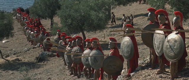 Happily, watching this as an adult can still be fairly stirring, as the elements that thrilled young eyes have held up. This sadly ignored epic deserves some TLC. Directed by Rudolph Mate, the 110-minute saga arrived near the end of the cycle of spectacles set in ancient times. It was dismissed by reviewers and poorly marketed by 20th-Century Fox. Handsomely produced for around $1,350,000, it features fine Greek location shooting by crack cinematographer Geoffrey Unsworth in rich color, and has some of the best costume design in the ‘toga genre’. Check out that Persian headgear! Note those cool shields the Spartans use, boldly embossed.