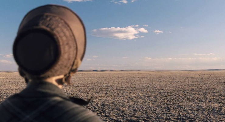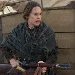 THE HOMESMAN takes place in the stark isolation and danger of the Nebraska Territory in the 1850s. Three pioneer wives are driven to insanity by the bleak, thankless conditions of a woman’s life on the prairie. A hardy spinster undertakes to guide the trio back East for the care that’s unavailable on the frontier (and away from their miserable husbands). She’s aided by a scruffy vagrant: en route, they deal with the harsh elements of natural and human nature.