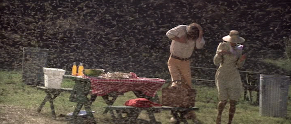 THE SWARM—-let’s say you’re eight or nine years old, and you’ve heard there’s a movie about those anti-social bees migrating north from the Amazon. Dad has a soul, Mom has a brain and somehow they’ve shielded you from pysche-warping slop like Hostel and minions. Maybe the sight of clouds of pissed-off bugs decimating Texas will fill the void, just as kids of the 50s thought the giant grasshoppers who lowered Chicago’s property values in Beginning Of The End looked cool.