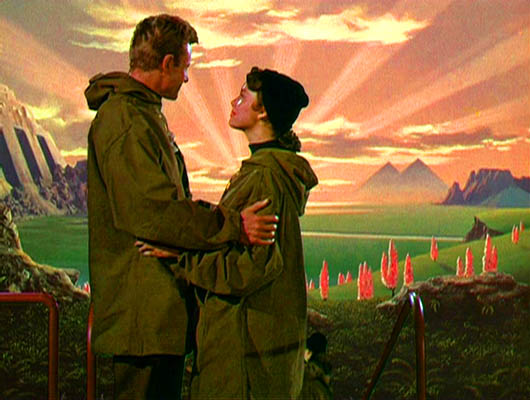 WHEN WORLDS COLLIDE—-another space body wants to share our orbital path, as in Head-On-Collision. Scientists select humanity’s Best & Brightest specimens for a Noah’s Ark type exit via a giant rocketship. Mankind’s cream, however, are represented by a darned bland cast, and 90% of this pioneer sci-fier is taken up by these earnest guys and spunky gals yakking out instantly forgettable gibberish.
