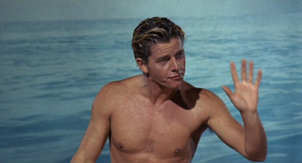 Harder to swallow are Brown & Eden, who approach barf-out being cute, with Hunter & Hart giving rival gorge playing wholesome. Salting up the candykorn are the three sandkickers, sneered across just right by Hayes, Mitchum and Davis (runner-up, Best Supporting Weasel). The location scenery is colorful, and Joseph Biroc’s camera captures some exciting waves and hot board action, along with some unintentionally hilarious back-projection shots of the stars trying to balance and smile while getting doused in the kissers with buckets of water: they were ‘riding’ Radio Flyer wagons in the studio.