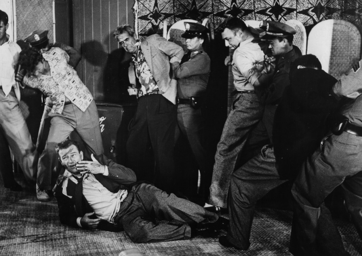 Yeah, like John Wayne and James Arness, by God–let the Reds tackle these bruisers. Dullish production, sensationalistic scripting, gung-ho acting, hopelessly one-sided flagwaving. What a gas, what a joke. If you can’t stand Wayne, you’ll love this item. If you’ll defend the Duke to the death, you’ll alternate between chuckles and yawns. The Communists are represented by jerks in general, ‘suspect intellectuals’ ,including a biologist, a labor relations counsel, a psychiatrist and a labor leader. In Italy, where American influence (make that extortion) had already raised hell with politics, the title was changed to Marijuana, and the soundtrack was dubbed to make it look like Hondo & Matt Dillon were after drug smugglers.