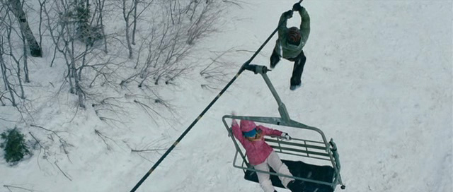 Waiting for them in the woods and slopes beneath are Man’s not-quite-Best-Friends—a pack of wolves. Maybe having whetted their snouts on The Day After Tomorrow, possibly warming up for chomping-out Liam Neeson’s team from The Grey; regardless, they’re on-site in New England’s hills (filmed in Utah) and those snowboarders dangling legs look much tastier than cold rabbit.