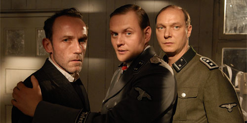 Lucky for them they have master forger Salomon Sorowitsch, ripped from his decadent playboy highlife and consigned to Mauthausen and then Sachsenhausen concentration camps, where he (beautifully done by Karl Marcovics) not only heads up their “work and live longer” team of prisoners, but uses every atom of his wit to walk as many sides of the wire as he can, for himself, for the captors, for the other inmates. Under the thumb of a scheming Sturmbannfuhrer (Devid Striesow, giving Ralph Fiennes in Schindler’s List a run for Vile), the lash of a brute Hauptscharfuhrer (Martin Brambach), and the conscience-goading of a fellow prisoner, Communist resister Burger (August Diehl, playing the man whose memoir the film is based upon), Sorowitsch acts as the intellectual, emotional and psychological fulcrum of the story. Marcovics’ iron-controlled characterization is a subtle marvel of underplaying.
