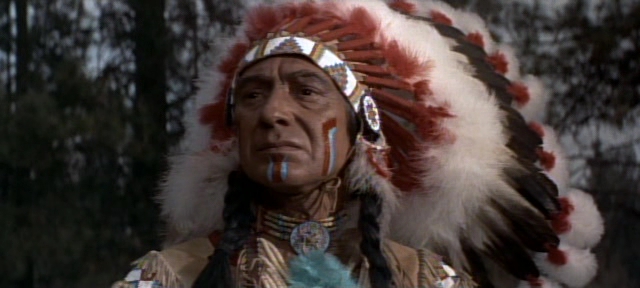 Walter Matthau is the bad guy—he debuted the same year, also playing a snake, in Burt Lancaster’s The Kentuckian. Others on board include Walter Abel, a noticeably booze-battered Lon Chaney Jr., Elisha Cook, Alan Hale Jr., Ray Teal, Frank Cady, William Phipps and Hank Worden. ‘Red Cloud’ is played, with stone-faced ‘dignity’ by Eduard Franz, who also suggested noble Native Americans in Broken Lance and the same years White Feather.