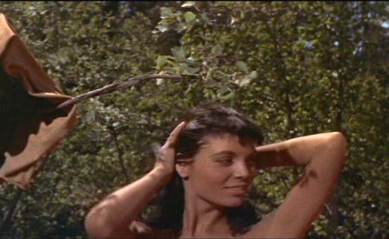 Now, Anne was Kirk’s 2nd wife. His first, Diana, co-stars here as secondary love-interest (thanks a load, baby). Meanwhile, Kirk, according to his memoirs, goes at it hot & heavy with Elsa. This is not hard to understand: one look at her here, bathing in a stream, when I first saw this a kid, pretty much helped cement my partner inclinations (along with Sophia Loren in The Pride And The Passion, so better or worse, I owe Italy a lot).