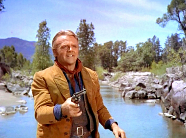 Along for outdoor flavor: Jean Hersholt, Jack Lambert, Grant Withers, Ray Teal, Trevor Bardette and Denver Pyle. Film did an acceptable $1,500,000, enough for Jimmy to do another horse opera the next year, Tribute To A Bad Man. Of reliable heavy Jack Lambert, the Internet Movie Data Base description has him an “ugly, slit-eyed, jut-toothed, cleft-chinned menace.” Got it.