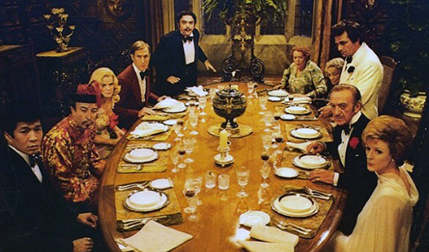 Gimmick has sendups of famous literary detectives invited to dinner at the stylishly forbidding home of ‘Lionel Twain’. Settled in, someone attempts to bump them off one at a time, ala Ten Little Indians/And Then There Were None.