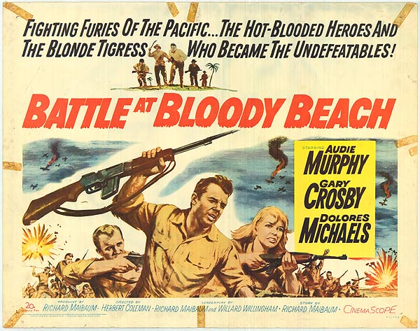 BATTLE AT BLOODY BEACH is of curiosity in that it’s the only war movie Audie Murphy appeared in besides The Red Badge Of Courage and To Hell And Back; the real-life WW2 hero instead shooting things up in 33 westerns of mixed quality. This awful 1961 programmer has him noticeably ill-at-ease, and his embarrassed performance here might be his worst. Supposed to take place in The Philippines, but filmed on Catalina, which looks about as tropical as Pennsylvania. The terrible script came from Richard Maibaum, who’d done some okay actioners prior and followed this with the first four smashing Bond films (and nine more later). He must have cranked this one out while undergoing migraines, the situations so ridiculous.
