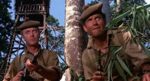 1942. British troops who escaped the debacle at Singapore share an island in the New Hebrides with a Japanese garrison, which includes an air base. They occasionally mix it up with skirmishes but mostly keep to their own sides of the island. When the Japanese radio outposts threaten to detect an approaching American convoy, the brass send in reluctant ‘Lt. Sam Lawson’ (Robertson, 46), a naval officer who speaks Japanese. Working under foolhardy ‘Capt. Hornsby’ (Denholm Elliott), who is detested by his men, Lawson and a patrol move into the thick jungle to knock out the station and try to get back alive. Among the team the one with the most sense—and one of the worst attitudes—is Cockney cynic ‘Tosh Hearns’ (Michael Caine, 36), the medic.
