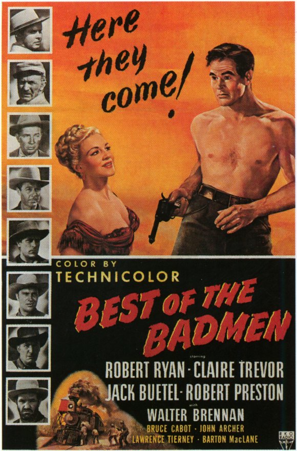 BEST OF THE BADMEN strew bull-puckey across the concept of truth-in-advertising in 1951 by fictionalizing the dagnappit out of the James-Younger crew, and director William D. Russell does guldurn little in 84 minutes to show us why Robert Ryan, Claire Trevor, Robert Preston, Walter Brennan and several hardy chums thought this would be worth signing up for. Some ridin’, some jawin’, some shootin’—time to go mow the lawn.