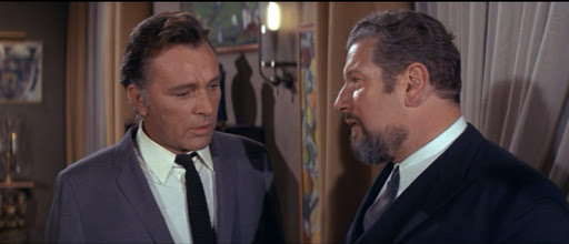 Burton does well putting across weary, bone-deep cynicism leavened with mordant wit, readily identifiable as a Graham Greene construction. Liz, on the other hand, tends to come over Taylor-made, with an accent that comes and goes; her background is supposed to be German and the writing for her character is not strong. Ford and Gish puff amusingly as the guileless, gullible Americans since Yanks in Greene-land never come away flattered. Ustinov’s cuckold character is reticent, the actor’s normal gusto therefore absent. Best of the star quintet is Guinness as the pathetic fake ‘Mr. Jones’; after 1960s Tunes Of Glory, it’s his most energetic and compelling performance of the decade.