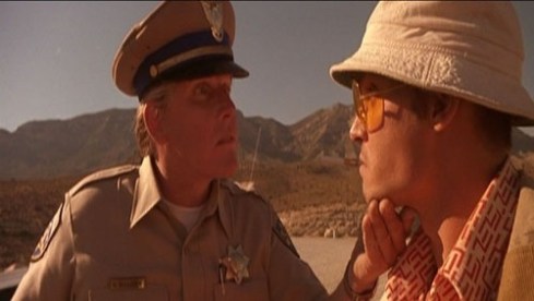 The early 70s. Magazine journalist ‘Raoul Duke’ (Johnny Depp) and his lawyer ‘Dr.Gonzo’ (Benicio del Toro) zoom across the desert from L.A. to Las Vegas, where Duke will do an article on a motorcycle race. Luck has it that there’s a convention in town, the National District Attorney’s Conference on Narcotics and Dangerous Drugs. Whew! What a break, considering Duke & Gonzo’s enhancement inventory: “We had two bags of grass, seventy-five pellets of mescaline, five sheets of high-powered blotter acid, a saltshaker half-full of cocaine, and a whole galaxy of multi-colored uppers, downers, screamers, laughers… Also, a quart of tequila, a quart of rum, a case of beer, a pint of raw ether, and two dozen amyls. Not that we needed all that for the trip, but once you get locked into a serious drug collection, the tendency is to push it as far as you can. The only thing that really worried me was the ether. There is nothing in the world more helpless and irresponsible and depraved than a man in the depths of an ether binge, and I knew we’d get into that rotten stuff pretty soon.”