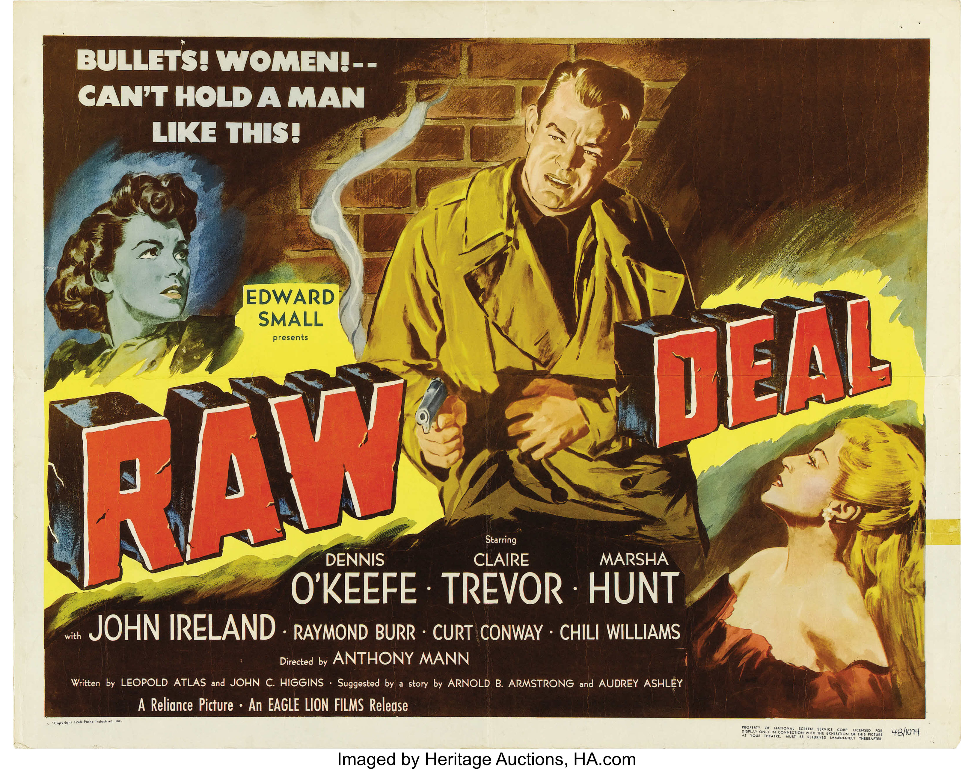 Writer Higgins and co-scenarist Leopold Atlas give the cast a taut script with some neat twists, director Mann stages it to move lean & mean, and doesn’t hold back on the rough stuff: Burr tosses flaming brandy into the face of his mistress when she spills a drink on him; O’Keefe and Ireland have a brutal hand-to-hand brawl that includes a set of antlers as a weapon–too close to the eyes for comfort; gunplay and a raging fire are enlisted when fists, kicks, bottles and furniture aren’t sufficient.