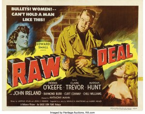 RAW DEAL indeed, for its ill-fated characters, but a sweet deal for film noir fans, as director Anthony Mann, cinematographer John Alcott, star Dennis O’Keefe and writer John C. Higgins team up again for some exquisitely imagined crime & punishment. Though it didn’t fare as well at the box office as their previous T-Men, this 1948 on-the-lam meller is a more involving and exciting picture, and holds up much better. *