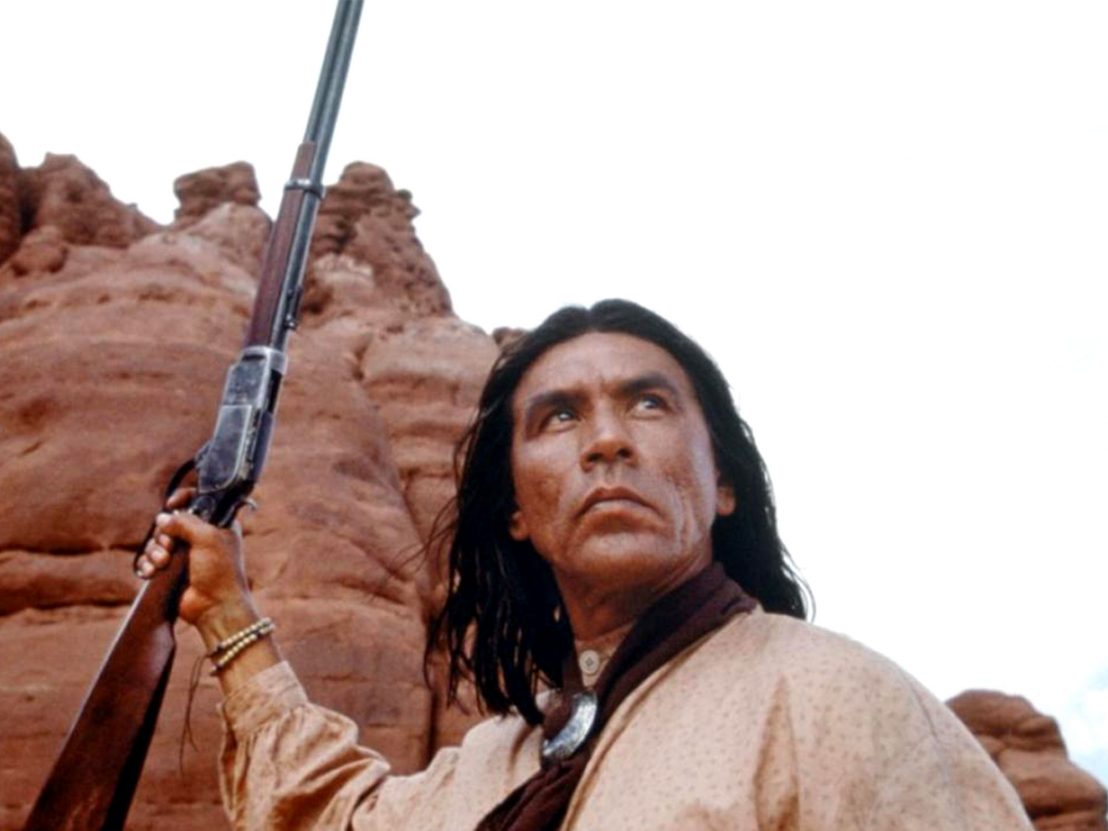 Supporting player Rodney A. Grant, who plays Mangas Coloradas in this picture, served as Geronimo in The Staircase, a 1998 TV movie, as well portraying Crazy Horse in another TV film, Son Of The Morning Star. Grant’s best known as ‘Wind in His Hair’ from Dances With Wolves, which also featured Wes Studi (as the mean Pawnee brave). Two years later, Studi’s sensational performance as ‘Magua’, in the terrific 1992 version of The Last Of The Mohicans cinched his hire as Geronimo.