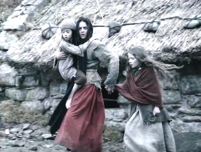 Lance Daly directed, and co-wrote the script with PJ Dillon, Pierce Ryan and Eugene O’Brien. 1847 saw the worst of the 7-year calamity of blight, plague and hunger that decimated Ireland’s population by millions from death and emigration. Shot in fitting wintry conditions, Daly had cinematographer Delcan Quinn use a washed-out color scheme to accentuate the numbing bleakness of the natural elements—climate, ecology and disease—adding an extra chill to the grotesque heartlessness of the authorities response. Though the tragedy was epic in scale, the movie keeps it up close and human, and the few CGI background renderings seem intended to evoke a faded storybook texture (either that or they’re just a wee shoddy–?) Beyond the basic redress-via-revenge setup that gives the story forward momentum and cathartic payback, intimate detailing tellingly conveys desperate straits. The choice of extras and bit players with their costuming and makeup and the language communication issue are very well handled. Frecheville’s intense glare, wounded, baleful and focused, puts over Feeney’s rage and rationale, and Weaving ably sketches a portrait of conflicted allegiance.
