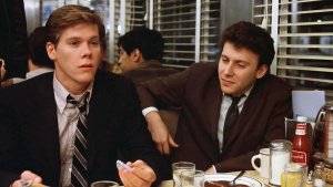‘Eddie’ (Steve Guttenberg, 23) is set to get married, but only if his fiancee can first pass a football quiz on the Baltimore Colts so detailed it makes astrophysics seem like checkers. ‘Shrevie’ (Daniel Stern, 26) has already taken the plunge, but his myopic “rules” have wife ‘Beth’ (Ellen Barkin, 27) fraying at the seams. ‘Billy’ (Timothy Daly, 25) comes in from out town to serve as Eddie’s best man, while ‘Fenwick’ (Kevin Bacon, 23) seems bent on dissipation. Smooth operator ‘Boogie’ (Mickey Rourke, 29) juggles law school studies with working as a hairdresser and getting in hock to thugs over bets. Hovering around the fringes is ‘Modell’ (Paul Reiser, 25), who has an answer for everything.