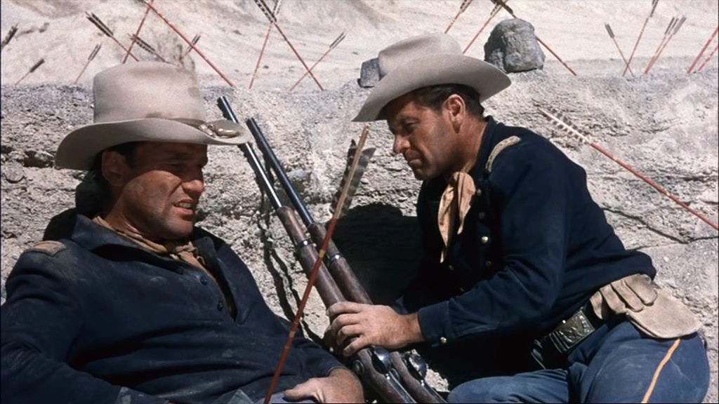 The Yanks & Rebs vs. Indians business had been visited by Robert Wise in 1950s neglected Two Flags West, and would later get hell-for-leather treatment from Sam Peckinpah in 1965s Major Dundee, where ‘Bravo‘s original idea guy Michael Pate once again played an Apache warrior.