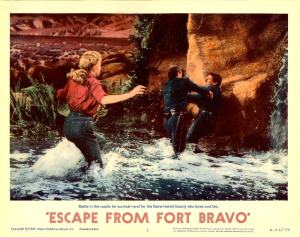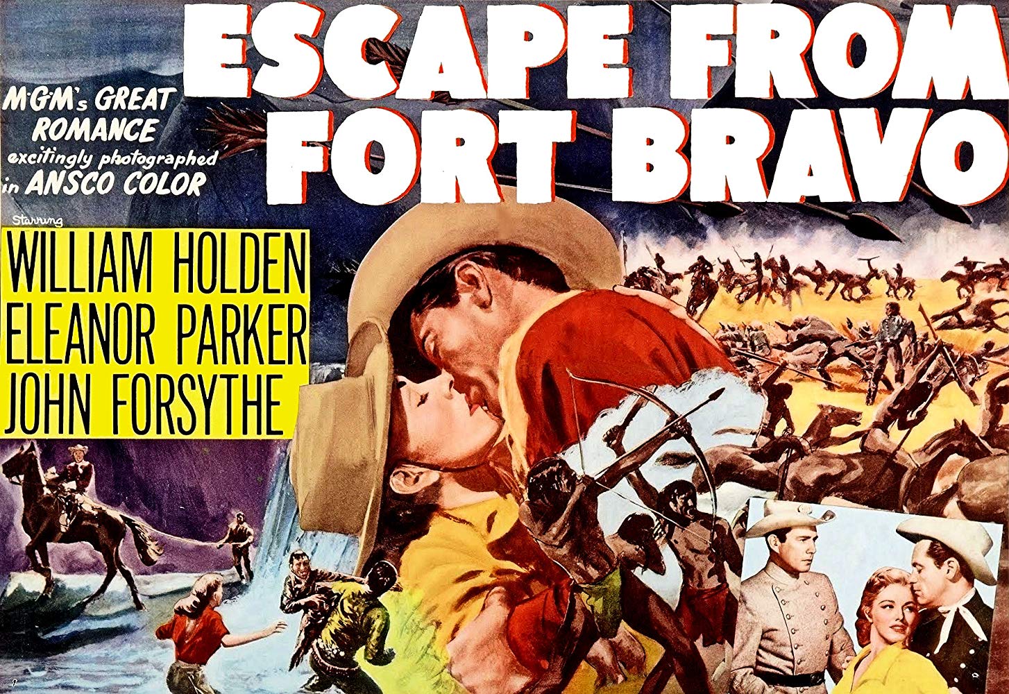 ESCAPE FROM FORT BRAVO—William Franklin Beedle Jr. was raised in sunny and peaceful South Pasadena, California, long after its Native American Xaxaamonga tribe had been displaced by settlers. As William Holden, he saddled up for un-peaceful westerns, ranging from immortal to ignominious. Not in the top tier, this 1953 entry at least ranks as serviceable. Holden scored two hits that year; The Moon Is Blue made a lot of money, and Stalag 17 won him an Oscar. This $1,520,000 cavalry patrol only ranked 73rd in ’53, though it covered costs by grossing $4,600,000. The best thing to come out of it was a career boost for no-nonsense director John Sturges.