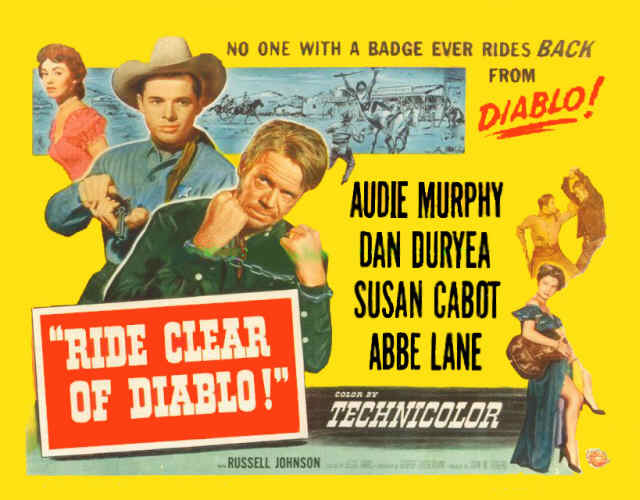 RIDE CLEAR OF DIABLO unless you’re in a lazy yesteryear mood for a standard Audie Murphy western, this one from 1954. Nothing to write home to Ma about, but worth some smiles for the familiar faces in the cast and some badinage between Murphy’s hero ‘Clay O’Mara’ and bad guy-turned-good-guy-helper ‘Whitey Kincade’, played with his usual merriment by Dan Duryea. WHITEY: “If I was smart, I’d shoot you right now. Except I think I’ll keep you around for awhile…just to see what makes you work.” CLAY: “Maybe you’re getting soft, Whitey. Maybe you’re turning into a human being.” WHITEY: “If I ever feel that coming on, I’ll shoot myself.”