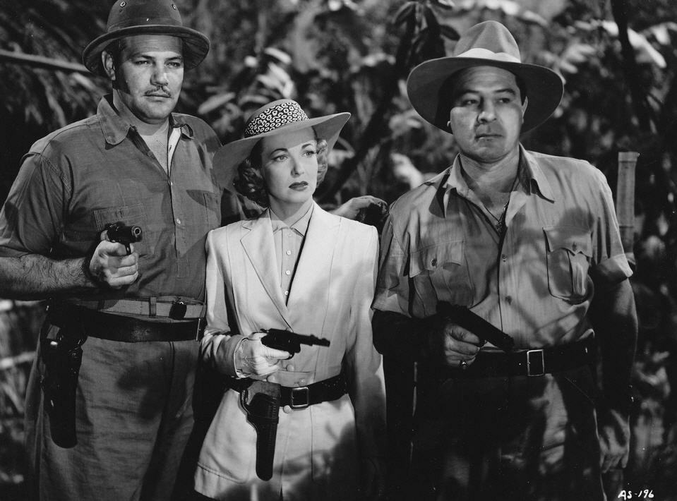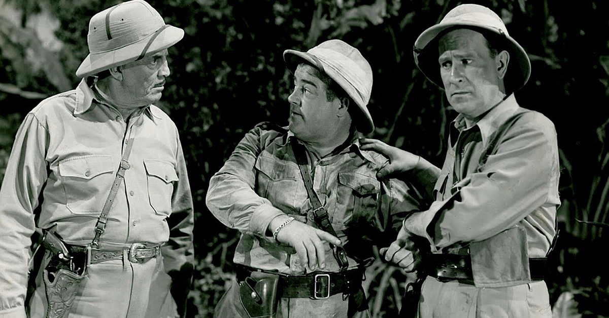 Glib bookseller ‘Buzz Johnson’ (Bud Abbott) talks ‘Diana Emerson’ (Hillary Brooke) into accepting fellow book salesman ‘Stanley Livington’ (Lou Costello) as an expert on Africa. Never mind that Stanley is terrified of animals, even kittens—“I was 15 years old before I ate my first animal cracker.” The guys don’t realize Diana has hoodwinked them into helping her locate a diamond treasure in the jungle. Cue escapades with lions, apes of all sizes, Diana’s hooligan henchmen, crocodiles and cannibals.