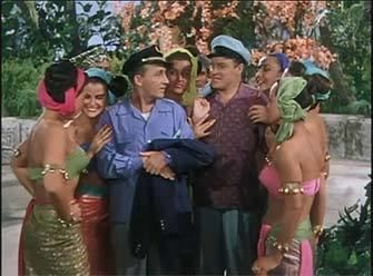 The ‘story’ this time has the guys as song & dance clowners out of work in Australia, talked into taking jobs as deep-sea divers for a prince in (then Dutch) Indonesia. Before things conclude with a volcanic eruption on the title island, they encounter ‘Princess Lala’ (Dorothy Lamour), who for some reason is half-Scottish, and her conniving cousin ‘Prince Ken Arok’ (Murvyn Vye). The sixth in the series also marks Lamour’s sixth time with them, and has six (mostly forgettable) songs written by written by Jimmy Van Heusen & Johnny Burke. Room is made for cameos from Dean Martin & Jerry Lewis, Jane Russell, Bing’s brother Bob and, in a clip from The African Queen, Humphrey Bogart.