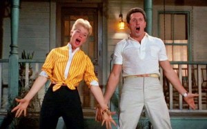 * There was one other musical-comedy involving a union, 1959s forgotten Never Steal Anything Small, with James Cagney and Shirley Jones (racketeers get in the mix). Back in ’57 The Pajama Game‘s competition included—in order of popularity—Pal Joey (Sinatra as a hip heel), Jailhouse Rock (Elvis stirs in stir), Loving You (Elvis agin’), Funny Face (Astaire & Audrey H.), Les Girls (Gene Kelly), Silk Stockings (Fred again, remaking Ninotchka), April Love (Pat Boone), Seven Hills Of Rome (Mario Lanza) and Jamboree (Alan Freed and Dick Clark host assorted rock’n’roll acts).