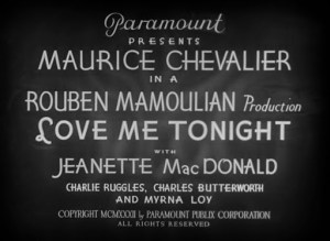 The Depression was underway and box office receipts were down. Adolph Zukor, head of Paramount Pictures, was vexed that two of his biggest stars, Chevalier and MacDonald were drawing large salaries with no project lined up. He tasked Rouben Mamoulian, who’d just scored a hit with Dr.Jekyll And Mr. Hyde, to come up with a winner. Mamoulian took a suggestion from playwright Leopold Marchand about reworking Le Tailleur au Chateau (The Tailor In The Castle), a piece he’d written in France eight years earlier with Paul Armont. He contacted Rodgers & Hart to write a score first, then had Samuel Hoffenstein (Laura, Cluny Brown), Waldemar Young (The Sign Of The Cross, The Lives Of A Bengal Lancer), and George Marion Jr. (You Can’t Cheat An Honest Man) adapt their script to suit. It’s considered the first in the genre where script and musical numbers are linked so closely that each tune serves a dramatic purpose and propels the plot. This was a full decade before Oklahoma!—with Mamoulian at the helm— would integrate those elements on the stage. The giddy screenplay is loaded with risqué innuendo, enough that censors felt taste-bound to whack at it. *