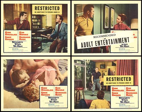 STRANGERS WHEN WE MEET puts Kirk Douglas and Kim Novak into an extra-marital affair conducted around tony Southern California locations in this glossy drama directed by Richard Quine. Evan Hunter wrote the script off his torrid 423-page novel about longing, desire and backstabbing in sunny, sinful suburbia, the well-heeled section. Critics dinged it, and a $8,300,000 gross, 39th place at the box office, was less than hoped for, but it’s an underrated, entertaining picture: there was a lot of hot & heavy competition that year revolving around the topics of love and lust. *