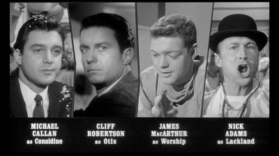 Callan is excellent until he’s forced to explosively (hilariously) wig-out in a split-second nervous breakdown when the pills finally frazzle him out. MacArthur is steady, Adams tiresome, Parker effective as the snooty model. Ebsen does good work as the more thoughtful veteran, while Savalas gets the harsh material. Brassy nightclub singer Stevens, in her acting debut, is garish, plus her character’s behavior is patently ridiculous. The berserk party scenes are elaborate, riotously foolish. Everything is well-photographed by Russell Metty. **