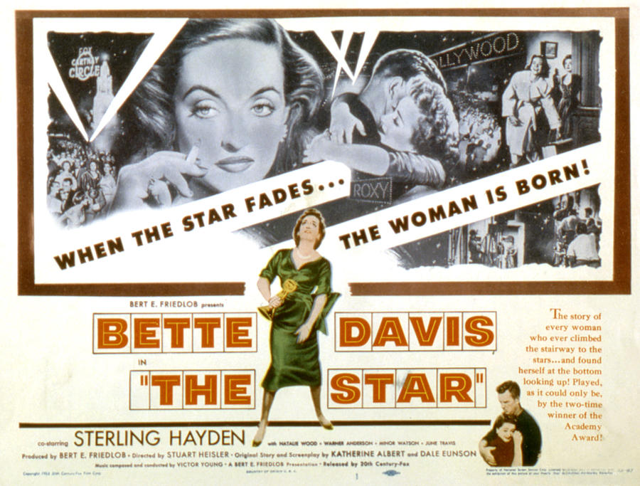 THE STAR got Bette Davis Oscar-nominated for Best Actress (her 10th of 11, with two wins) in this half considerate/half campy 1952 vehicle. The 44-year-old tackled the role of an actress her age coming to grips with the reality that she’s “past her prime” (at least in female movie star terms) and no longer bankable as a leading lady. Hollywood Giveth & Hollywood Taketh Away, in the biz-flaying mold of Sunset Boulevard and the same year’s The Bad And The Beautiful.