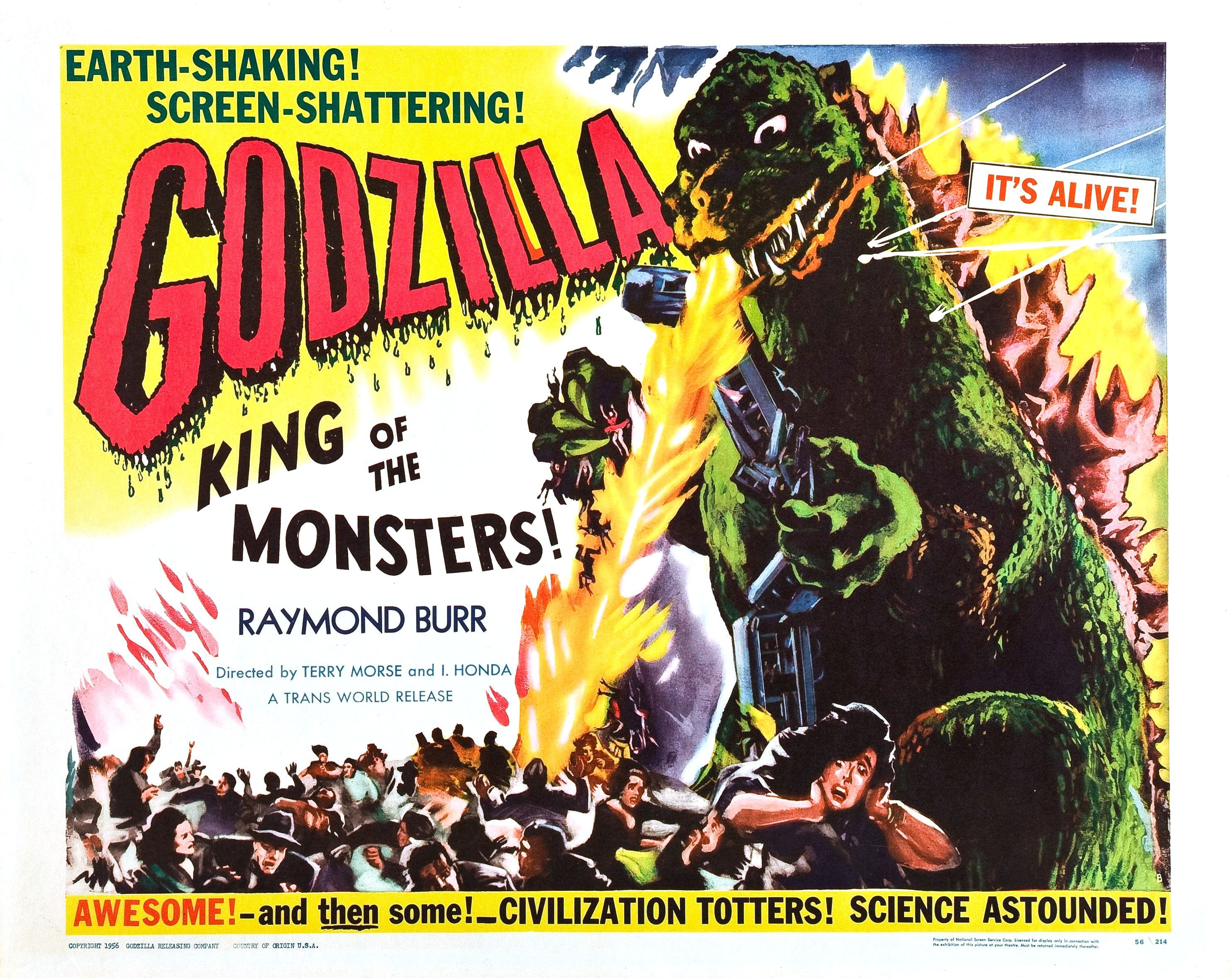 GOJIRA terrorized Japan in 1954, laying waste to Tokyo. The dinosaurian destruction display a success, the World’s Most Famous/Feared/Beloved Lizard lumbered into US theaters two years later, reedited, adorned with the presence of Raymond Burr and christened with an ever-after monicker, GODZILLA, KING OF THE MONSTERS!