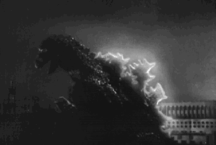 Roused from the depths of the Pacific by radiation, his sink & stomp attitude toward boats and buildings enhanced by an ability to light up and spew atomic breath, the signature honking roar letting panic-stricken crowds, stunned scientists and stymied soldiers know that tanks, jets and mass zaps of electricity just tick him off to no end, Gojira/Godzilla wins the admiration of children like no-one since Santa.