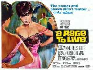 A RAGE TO LIVE is Tame teasing as Tawdry, circa 1965, in a critically and financially unsuccessful adaptation of John O’Hara’s 1949 bestseller. The book, 752 pages worth, was set in the pre-WW1 era, but John T. Kelly’s bland, frequently laughable script updates it five decades, with undistinguished direction by Walter Grauman. Suzanne Pleshette does what she can with the lead role: caring but cursed ‘Grace Caldwell’, raging to live with an unbridled sex drive.