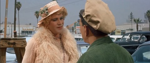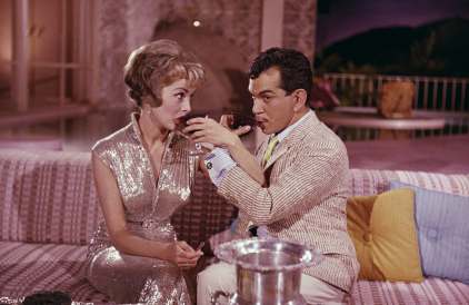 A trip to Vegas and ‘The Sands’ includes “cute” stuff with the casino’s part-owner Frank Sinatra and fellow Rat Packers Dean Martin, Sammy Davis Jr., Peter Lawford and Joey Bishop, plus Sands manager Jack Entratter for the hell of it (and to keep Frank happy). There’s a booze-hallucination number that has a miniaturized Debbie Reynolds doing an insane drunken dance with Cantinflas to the wails of “Tequila”. Jack Lemmon in drag turns up from Some Like It Hot, Kim Novak is shown being ‘real’ buying jewelry, Janet Leigh showcases a “star at home” (she’s fun to watch, and does what she can to brighten up her addition). But wait—there’s Bobby Darin, Bing Crosby, Zsa Zsa Gabor, Maurice Chevalier, Hedda Hopper, Jimmy Durante, Charles Coburn, Billie Burke, Cesar Romero, Richard Conte, Ann B. Davis, Tony Curtis, Greer Garson, Ernie Kovacs, Jay North (as ‘Dennis the Menace’), Donna Reed, Andre Previn, Edward G. Robinson, William Demarest.