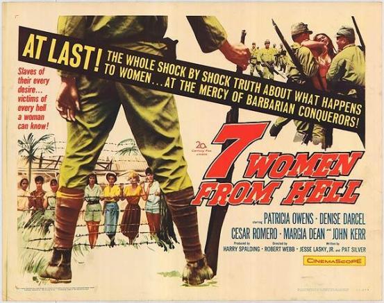 SEVEN WOMEN FROM HELL is…awful: climbing over stiff competition, this may be the worst movie released (“escaped”, as the joke goes) in 1961. A cheapie matchup of ‘women in prison’ exploitation camp and WW2 captivity saga, it was written by the husband-wife team Jesse Lasky Jr. & Pat Silver Lasky, presumably using crayons after a poolside lunch of cocktails, highballs and slings. *