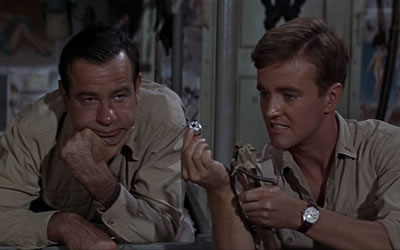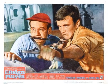 As the war (#2) plays out in the Pacific, an unhappy cargo ship is anchored in the doldrums of routine, sweating out the tropical heat under the petty tyranny of ‘Captain Morton’ (Burl Ives). Philosophical but pragmatic ‘Doc’ (Walter Matthau) bears it better than most of the sailors, but squirrely ‘Ensign Frank Pulver’ (Robert Walker Jr.) is extra-frustrated. Not popular with the men, like the deceased ‘Lt. Doug Roberts’, Pulver can’t seem to catch a break on “the worst ship in the Navy.” If only some nurses would land on the nearby island, or maybe a typhoon could provide a stray gust at being a hero.