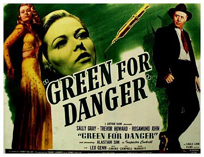 GREEN FOR DANGER —mystery classic from England in 1946, with a choice cast in an adaptation of a novel written two years earlier by Christianna Brand, one of seven she spun featuring the hawkishly keen ‘Inspector Cockrill’. Sidney Gilliat directed, co-writing the screenplay with Claude Gurney. It was the first movie made by Pinewood Studios, with a budget said to have gone over £725,000/$1,000,000, a tidy sum for the British film industry in the lean post-war days. A hit in England, in the States a whispy $580,000 only touched 159th place, the title changed to The Mad Killer, effectively reducing clever to cheap.