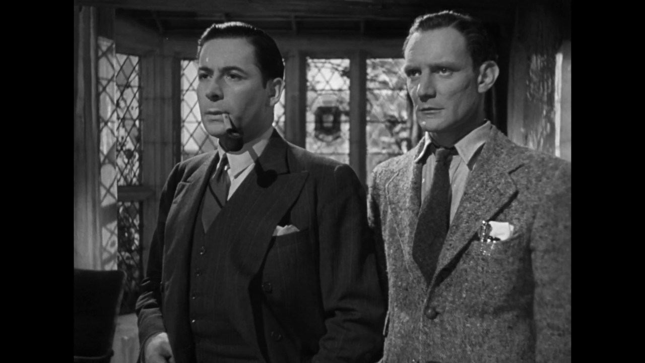 England, summer of ’44. With Hitler’s V-1 bombs peppering the war-fatigued country, two unexplained deaths—one clearly a murder—at a rural hospital bring acerbic, somewhat eccentric Scotland Yard Inspector Cockrill (Alastair Sim) out to investigate. Suspects include an anesthetist (Trevor Howard, a surgeon Leo Genn), and three nurses, one of them (Sally Gray) engaged to one of the men but pursued by the other. Jealousy, short fuses, checkered history, convenient coincidences and questionable decisions fray trust and nerves, but the bemused Cockrill has a grand time pecking it out.