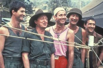 Written & directed by Tom Jeffrey, it’s adapted from the 1975 novel of the same name by ex-soldier William Nagle, based on people he knew when he served in Vietnam. Nagle later wrote the script for another Vietnam War pic, much more combat-oriented, The Siege Of Firebase Gloria. This one has a few brief action scenes but in the main it’s concerned with the day-to-day coping. Weather, food, foot rot, boredom, and loss are reflected through a few mates trying to survive their tour of duty, aided by a barrage of friendly insults and a considerable consumption of beer. The script takes no particular stance other than cynicism, and has plenty of the camaraderie banter standard for Guys Dealing with Shit situations, albeit with a Down Under tang. One segment is overdone, a comic brawl that explodes between the unit and a US outfit after they lose bets on an insect-fight (‘your spider vs. our scorpion’); it’s amusing, but really belongs in a John Ford movie from an earlier day. Otherwise, excess is kept in check, sentimental gas is absent, and the combat movements seem like they were coordinated by someone who actually knew his stuff.