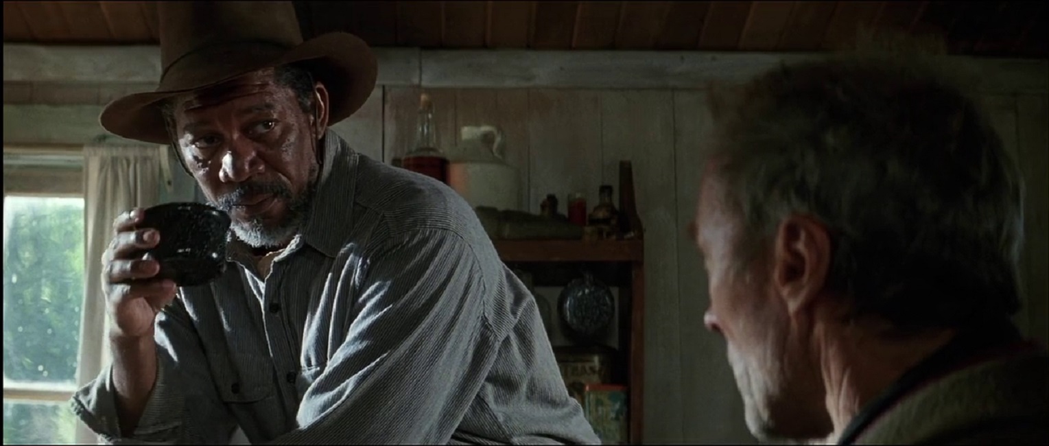 Eastwood is ‘Will Munny’, once a feared killer, now a broken-down sodbuster who has trouble getting on a horse. Will, old comrade ‘Ned Logan’ (Morgan Freeman) and a cocky poser (Jaimz Woolvett) self-daubed ‘The Schofield Kid’ aim to blast the perpetrators and collect their due. Facing them in the muddy hamlet of ‘Big Whiskey’ are calmly vicious sheriff ‘Little Bill Daggett’ (Gene Hackman) and his deputies. Little Bill has already dealt a visit from renowned pistoleer ‘English Bob’ (Richard Harris).