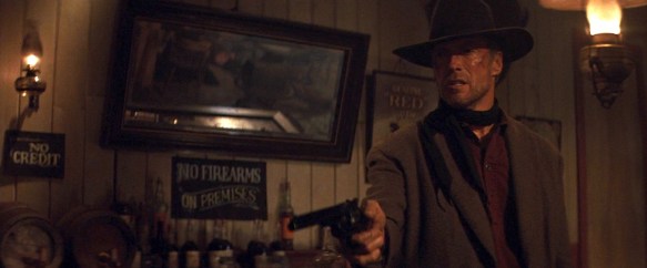 UNFORGIVEN, written by David Webb Peoples, had been around for 15 years, and on Clint Eastwood’s docket for nine before he finally produced, directed and starred in it, reaping critical laurels, industry accolades and a box office hit. Shot in Alberta, Canada for $14,400,000, it was #11 in the States in 1992, grossing $101,200,000, with another $58,000,000 internationally. The Academy Awards anointed it Best Picture, Director, Supporting Actor (Gene Hackman) and Film Editing, with nominations for Actor (Eastwood), Screenplay, Cinematography, Art Direction and Sound. That’s a lotta rawhide. It’s a palate ponder as to whether the beef behind the herd’s stampede of praise really cooked a steak with trimmings or just a good cheeseburger, minus milkshake. *