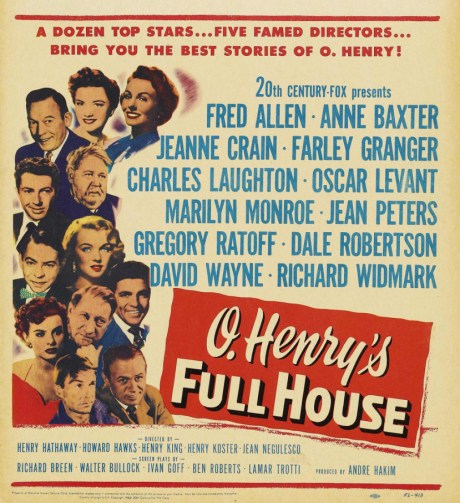 O. HENRY’S FULL HOUSE has five of the most popular short stories from the beloved author spun into an anthology from 20th Century Fox in 1952. A showcase for a dozen of the studio’s contract stars and a quintet of veteran directors, it was in part spurred by three recent British films that had used the anthology form to good effect for W. Somerset Maugham stories, and partly to compete with rival MGM pushing its own a multi-segment audience catnip. It also fit in with the Americana theme Fox was on that year, with a slew of the studios 39 releases having some native nostalgia pull attached. *