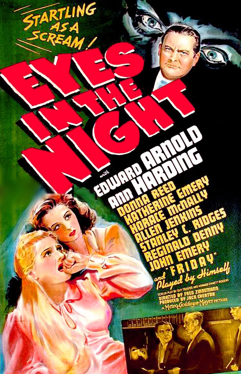 EYES IN THE NIGHT is a swell little find from 1942, one of the first movies directed by Fred Zinnemann. The script by Guy Trosper and Howard Emmett Rogers was adapted from “The Odor Of Violets”, the third of a dozen novels written by Baynard Kendrick featuring sightless sleuth ‘Duncan MacLain’ and his German Shepherd ‘Friday’, the poster pooch for seeing-eye-dog detectives.