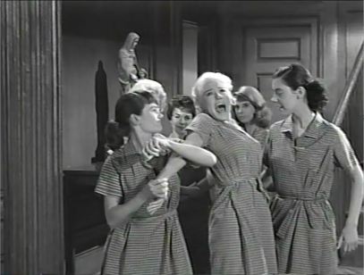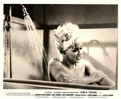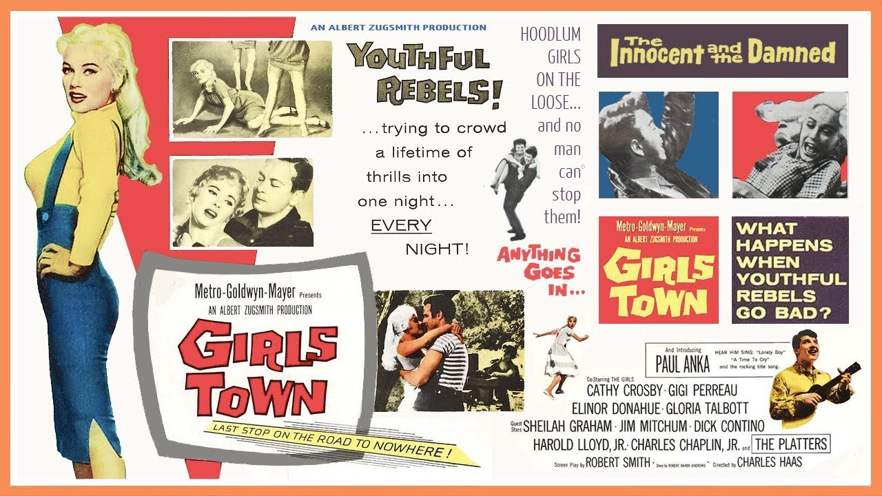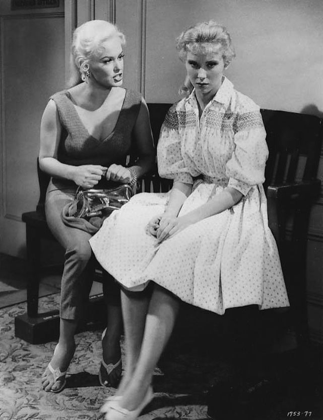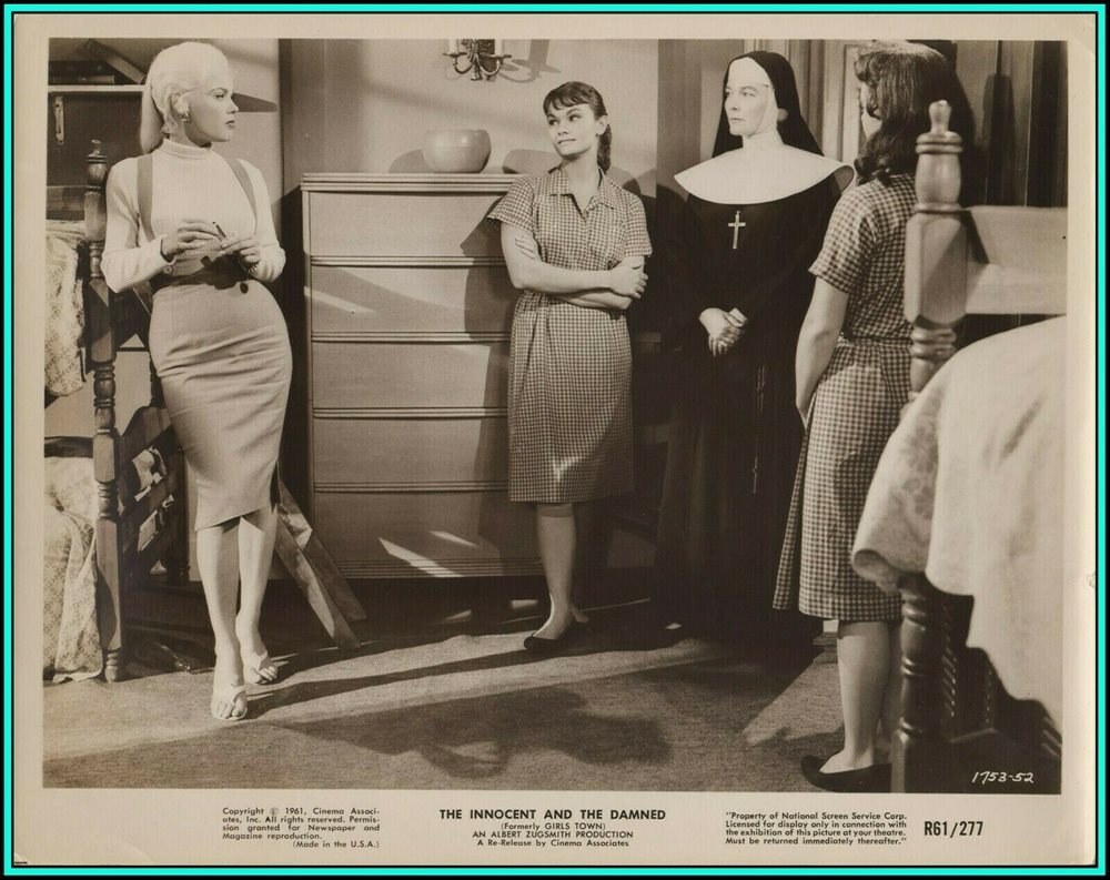 Sixteen-year-old hellcat ‘Silver Morgan’ (Van Doren, 27), blamed for the cliff-plummet death of a local creep, is sent to a rehab facility run by nuns, where her snarl-pout is stuck putting up with their rules, and with a clutch of punkettes. When ‘Fred’, the area’s head jerk, conspires to ship her kid sis ‘Mary Lee’ to Tijuana as a white slave, Silver brings her game on and faces down the drag-racing crowd. A punk named Fred—and he’s played by Mel Torme? Imperiled sis is Elinor Donahue, aka ‘Betty Anderson’, freed at 21 from Father Knows Best, here equipped with blonde hair and tight sweater to pass as Mamie’s kin. As to La Van Doren, considering how wantonly she thrusts her superstructure forward, she may as well be Mammaries Von Doorknobs, but her style of playacting is perfect for the tawdry-meets-moronic material. Tossed in for kicks is teen idol Paul Anka,18, in his first “dramatic” role. You have to put up with him warbling “Ave Maria”, but he does belt out his classic “Lonely Boy”. *